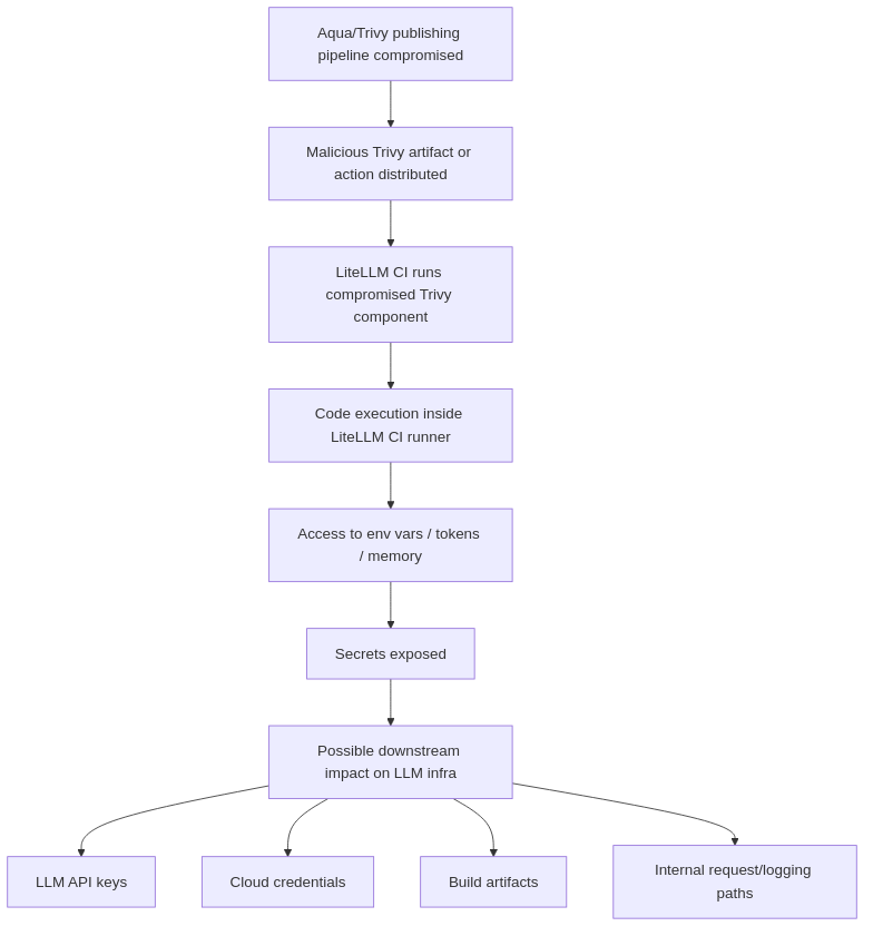 Public reporting links the LiteLLM compromise to the same broader campaign associated with the Trivy incident, but the exact intrusion path and sequencing should still be treated carefully unless confirmed by maintainers or incident responders.